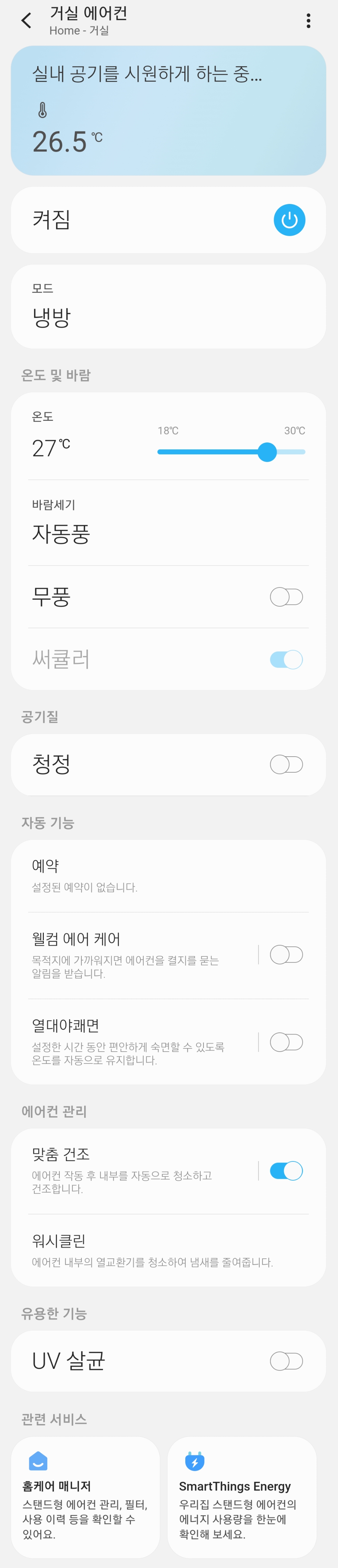 Smart Things 앱에 에어컨을 등록하면 리모컨 필요 없이 앱으로 세세하게 설정이 가능합니다.