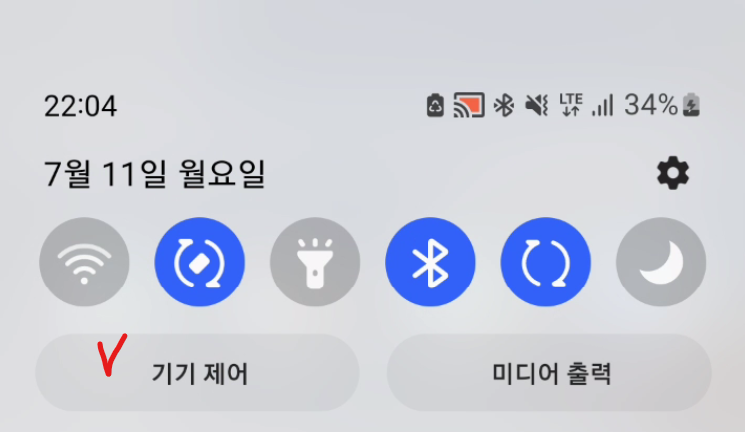 폰 화면을 내려서 나오는 화면에 "기기 제어"가 바로 떠서 에어컨 제어가 굉장히 쉽습니다.